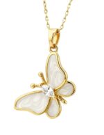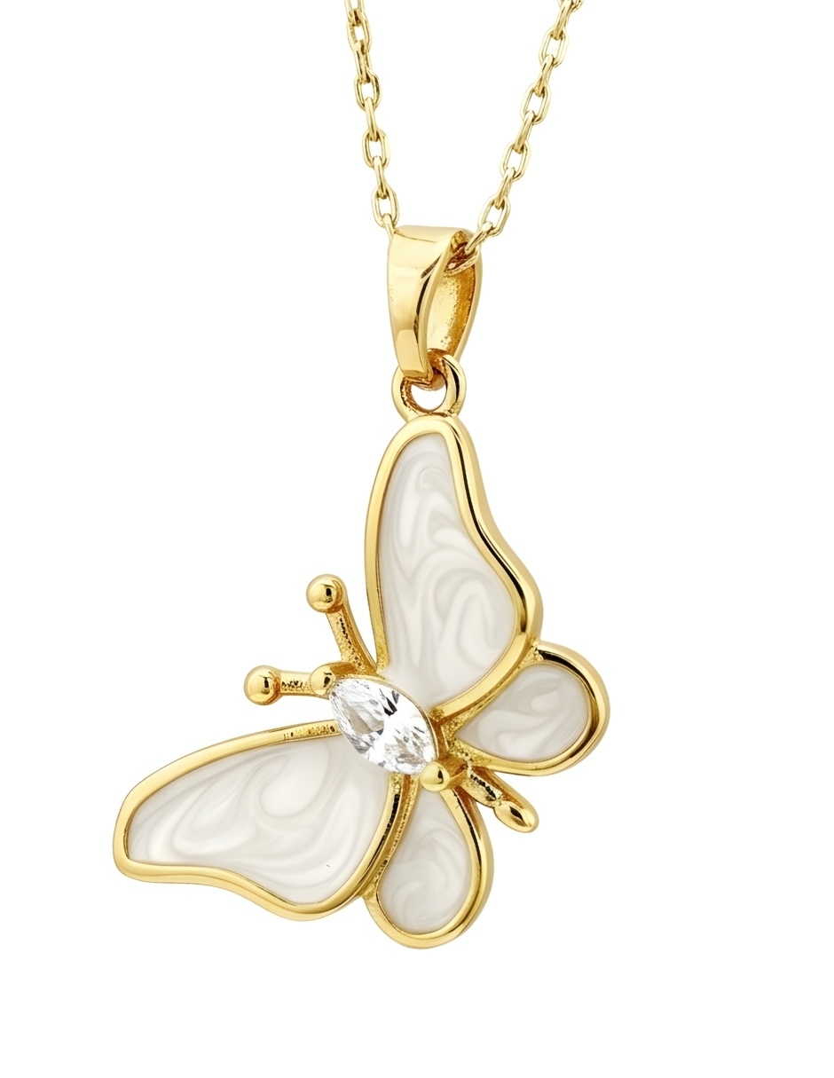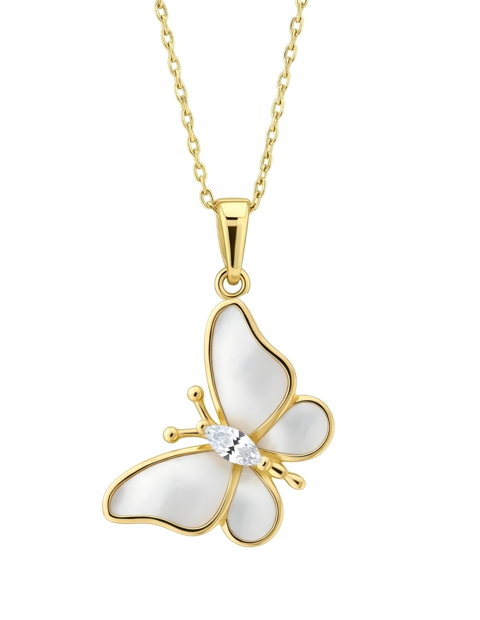 Hermosos collar con dije de chapa de oro amarillo de 18k de alta calidad, colección aurore, elegante dije con diseño de mariposa de 24.5 x 18mm, esmaltado color madre perla con dorado con 1 circonia, cadena de 45 cm de largo. En tu compra recibirás una bonita bolsa para regalo y estuche de la marca zvezda, así como tu certificado de autenticidad y garantía del producto. Juntos, celebramos la creación de joyería de moda única donde te invitamos a ser parte de este majestuoso universo lleno de brillo y pasión con zvezda, donde encontrarás el regalo perfecto para cumpleaños, aniversarios, navidad, día de las madres y cualquier otra ocasión. Todas nuestras piezas son desarrolladas con materiales de alta calidad, con un estilo fashion, moderno y elegante, ideales para la mujer de hoy.