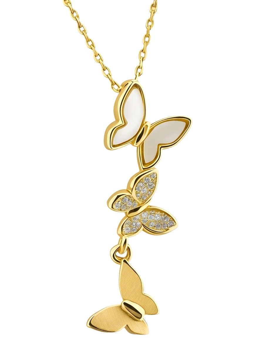 Hermosos collar con dije de chapa de oro amarillo de 18k de alta calidad, colección aurore, elegante dije con diseño de mariposa triple de 30 x 11.5mm, color madre perla con dorado con 18 circonias, cadena de 45 cm de largo. En tu compra recibirás una bonita bolsa para regalo y estuche de la marca zvezda, así como tu certificado de autenticidad y garantía del producto. Juntos, celebramos la creación de joyería de moda única donde te invitamos a ser parte de este majestuoso universo lleno de brillo y pasión con zvezda, donde encontrarás el regalo perfecto para cumpleaños, aniversarios, navidad, día de las madres y cualquier otra ocasión. Todas nuestras piezas son desarrolladas con materiales de alta calidad, con un estilo fashion, moderno y elegante, ideales para la mujer de hoy.