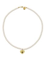 Hermoso Collar ZVEZDA con dije, Perlas de cristal y chapa de oro 18K de alta calidad, colección Éclair, elegante diseño de perlas de cristal de 8mm de diámetro color Cream y dije de Corazón liso abombado de 16mm de largo, medidas disponibles 45cm y 50cm de largo, elaborado por artesanos mexicanos con Perlas de Cristal Swarovski y Chapa de oro amarillo de 18K.