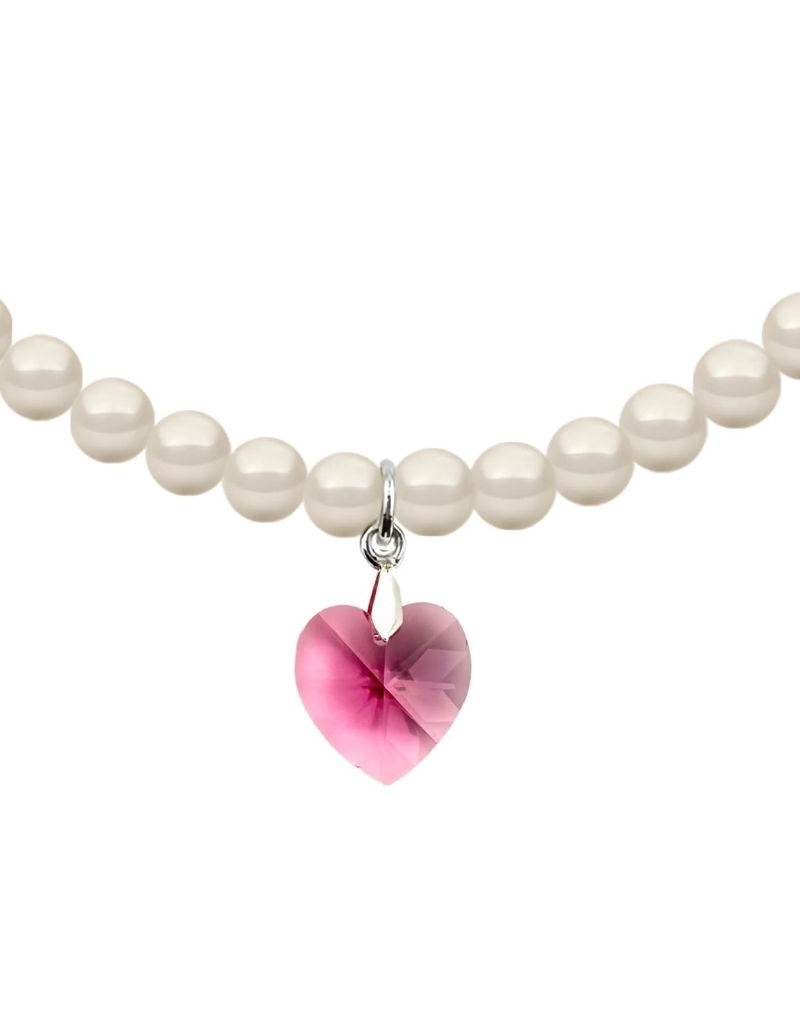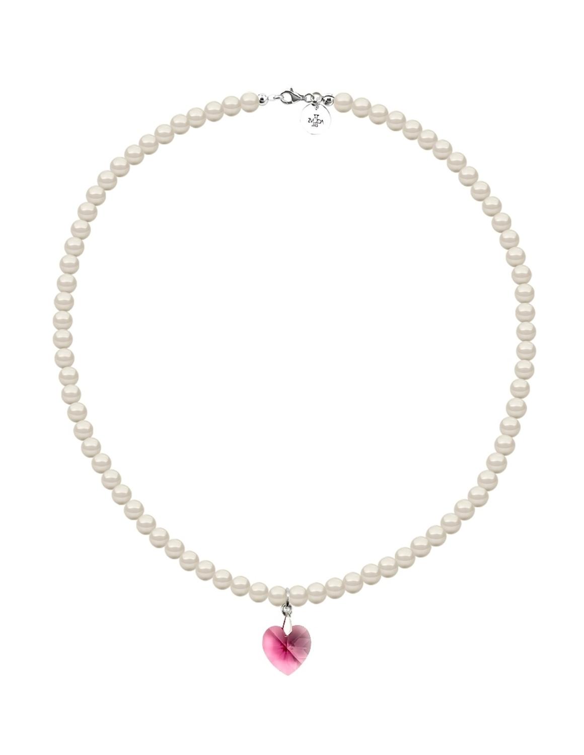Hermoso Collar ZVEZDA con dije, Perlas de cristal y Plata .925, colección Éclair, elegante diseño de perlas de cristal de 6mm de diámetro color Cream y dije corte Corazón de 14mm de largo color Rose con medidas disponibles de 45cm y 50cm de largo, elaborado por artesanos mexicanos con Perlas de Cristal Swarovski y Plata .925.