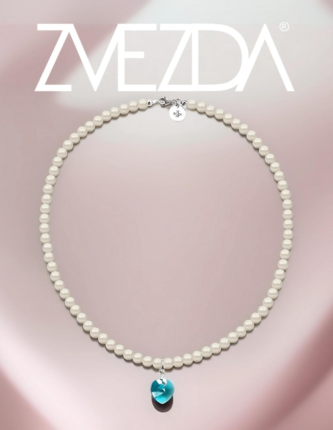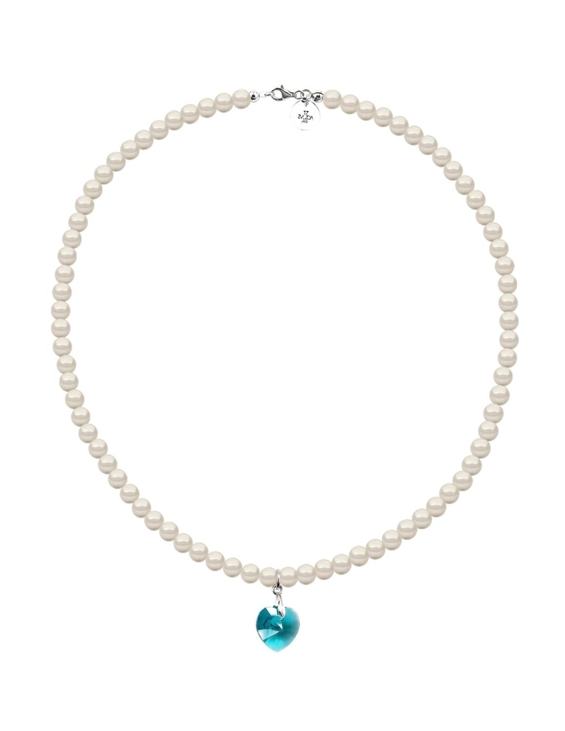 Hermoso Collar ZVEZDA con dije, Perlas de cristal y Plata .925, colección Éclair, elegante diseño de perlas de cristal de 6mm de diámetro color Cream y dije corte Corazón de 14mm de largo color Blue Zircon con medidas disponibles de 45cm y 50cm de largo, elaborado por artesanos mexicanos con Perlas de Cristal Swarovski y Plata .925.