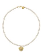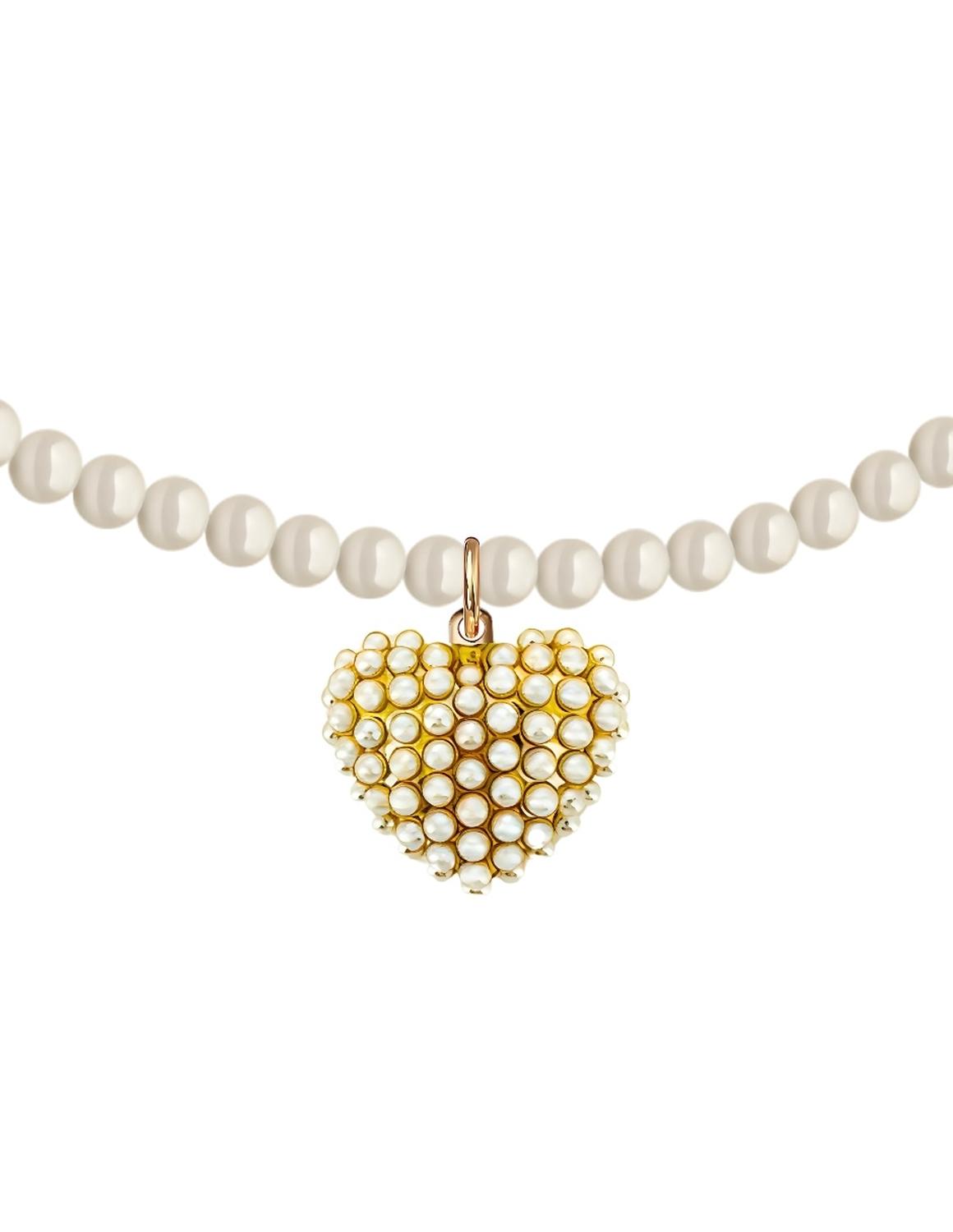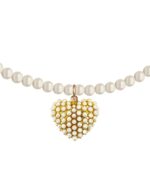 Hermoso Collar ZVEZDA con dije, Perlas de cristal y Chapa de oro 18K, colección Éclair, elegante diseño de perlas de cristal de 6mm de diámetro color Cream y dije de Corazón con perlas 20mm de largo, medidas disponibles 45cm y 50cm de largo, elaborado por artesanos mexicanos con perlas de Cristal Austriaco y Chapa de oro amarillo de 18K.