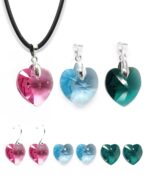 Hermoso Set de collar con dijes y aretes ZVEZDA de plata ley .925, colección Élan, elegantes cristales corte Heart , modelo A colores Rose, Aquamarine y Emeral, modelo B colores Bermuda Blue, Vitral y Siam, pendientes de gancho, 1 par de ganchos de plata .925 intercambiables, caucho de 45cm de largo, elaborado a mano por artesanos mexicanos, con Cristales Austriacos y Plata mexicana .925.